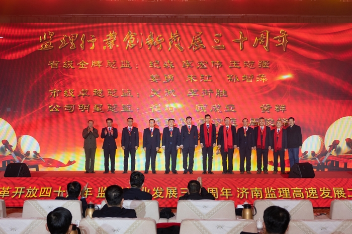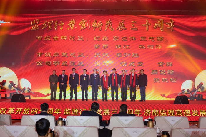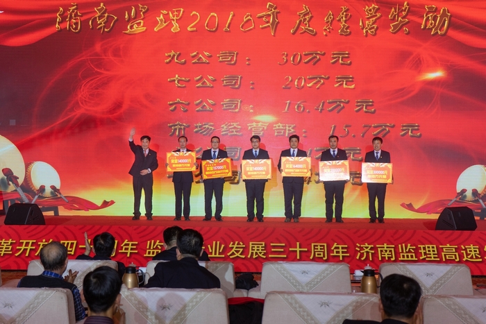 在節(jié)目中間穿插了抽獎、頒獎環(huán)節(jié),現(xiàn)場播放了退休老干部采訪、榜樣和大拜年視頻,成為晚會溫馨的一幕。晚會現(xiàn)場舉行了隆重的表彰儀式,山東省住建廳原巡視員耿慶海廳長,省城鎮(zhèn)化工作領導小組辦公室專職副主任宋錫慶副廳長向6名“濟南監(jiān)理功勛人士”頒發(fā)證書;濟南市城鄉(xiāng)建設委員總工程師王冠一 ,原市重點辦副主任崔兆林向6名“ 省級金牌總監(jiān)”、2名“市級卓越總監(jiān)”和11名“濟南監(jiān)理明星總監(jiān)”頒發(fā)證書;董事長林峰向6個單位代表頒發(fā)2018年度經營獎勵。